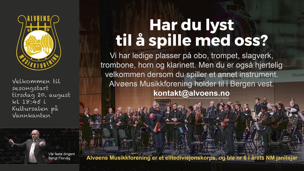Alvøens Musikkforening er et aktivt elitekorps, og øver hver tirsdag fra kl. 19-22 i kultursalen på Vannkanten.Høres dette ut som noe for deg? Ta kontakt da vel!